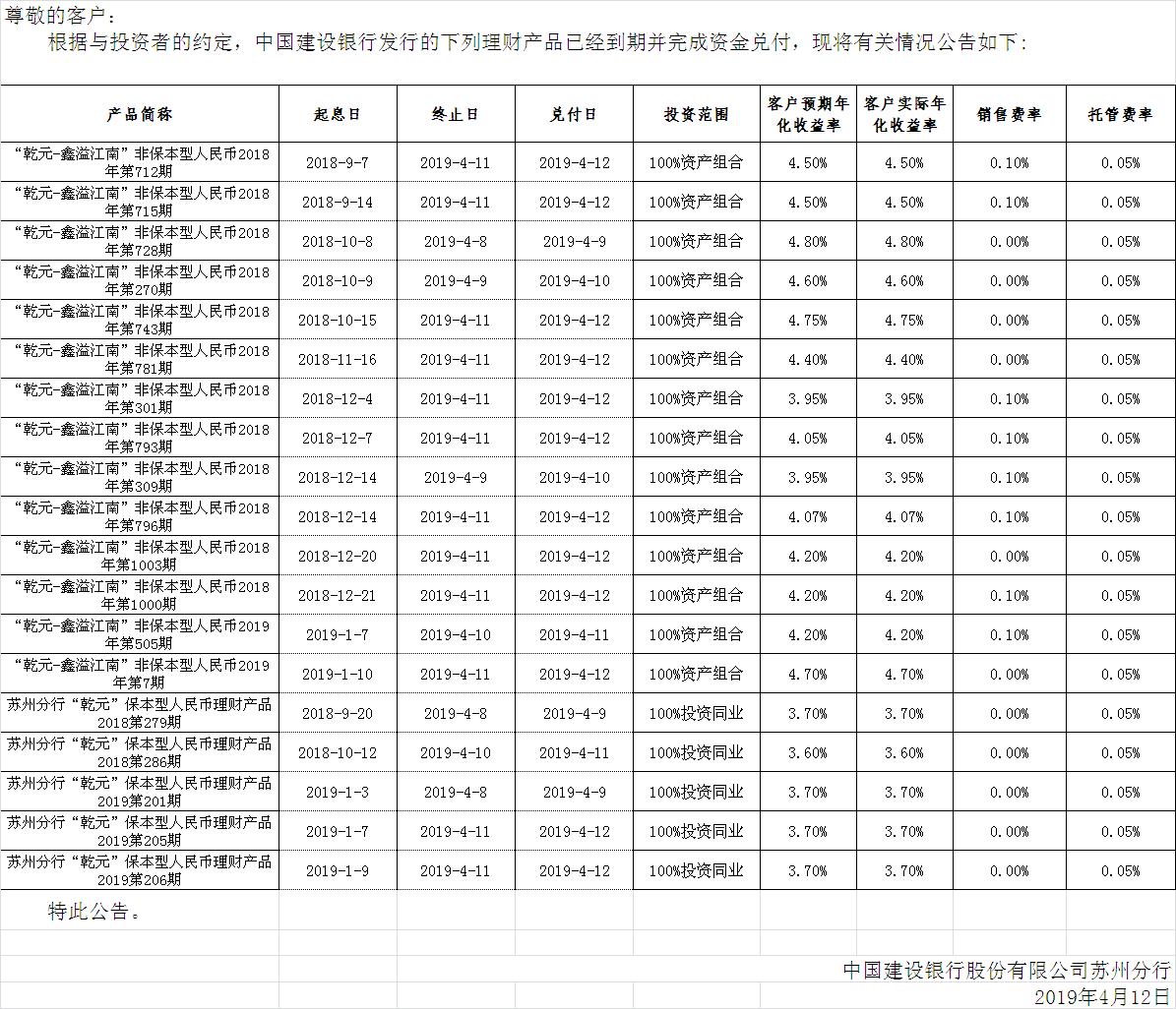 中国建设银行理财产品终止及清算公告
