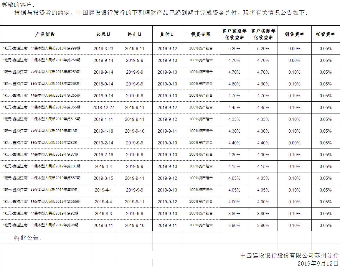 中国建设银行理财产品终止及清算公告