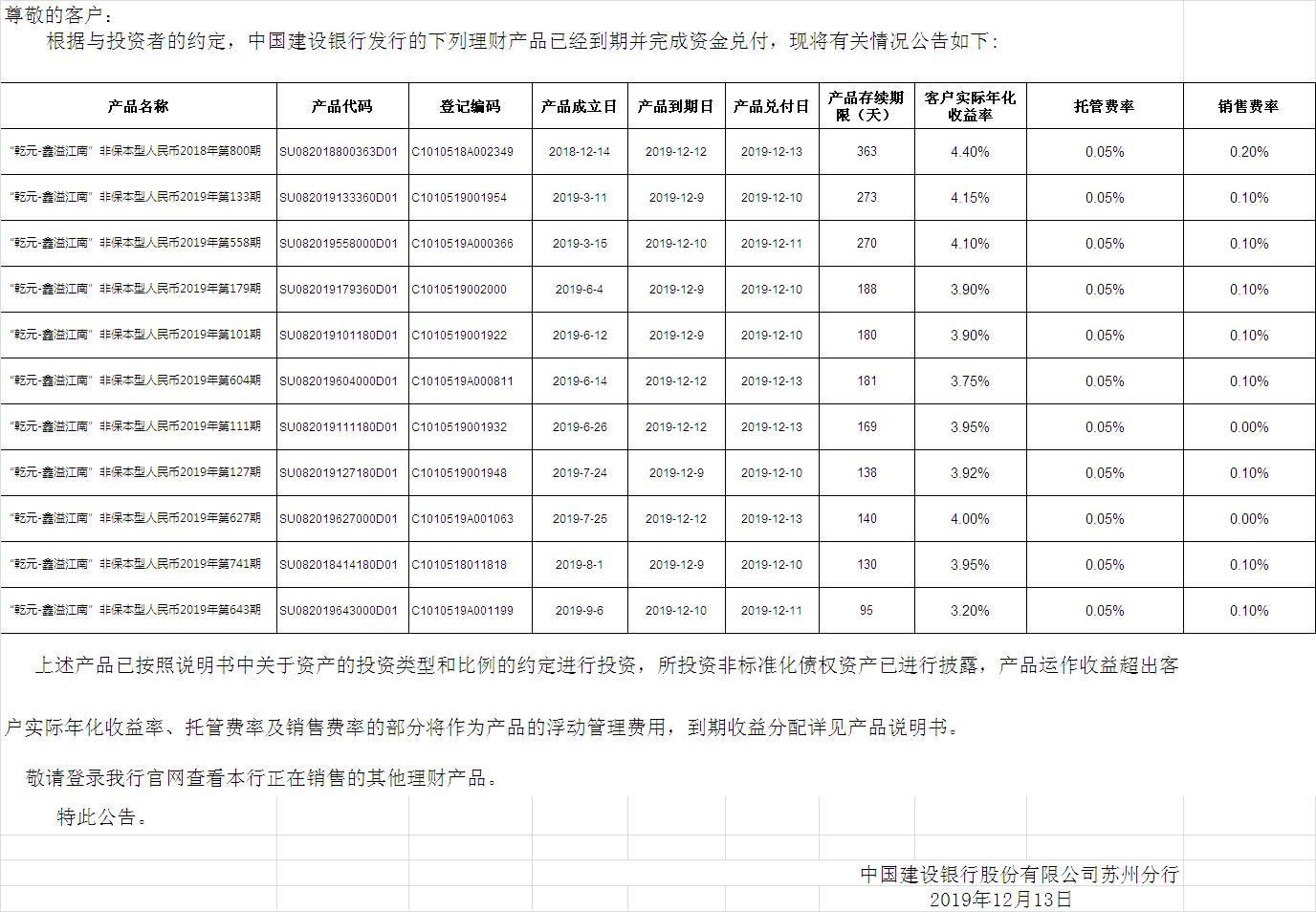 中国建设银行理财产品终止及清算公告